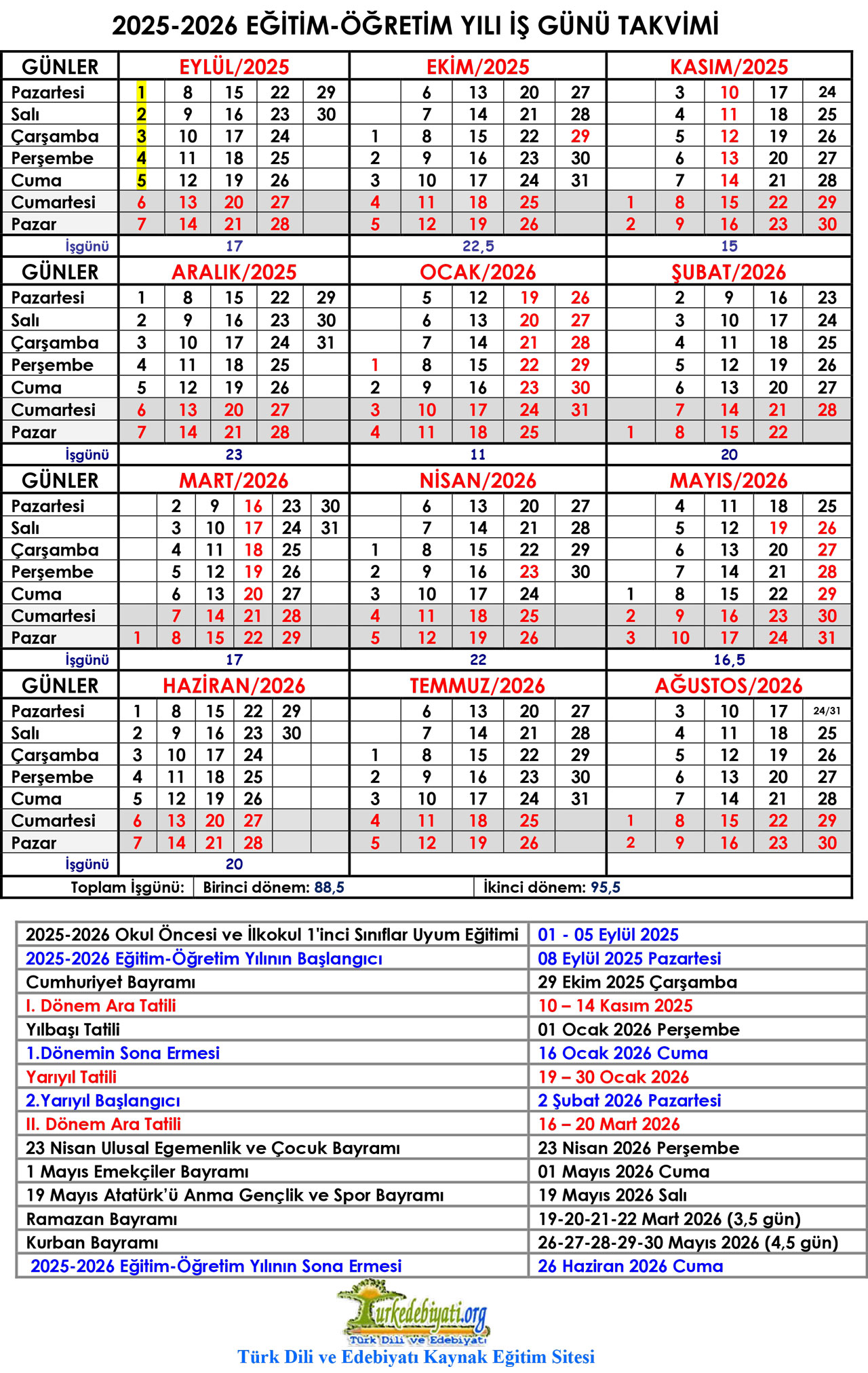 5. Yıllık İş Günü Çalışma Takvimi